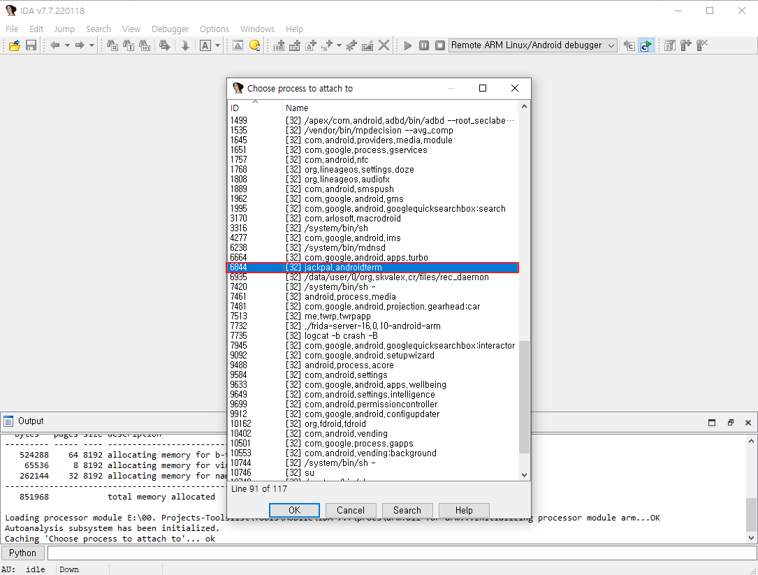 4. 프로세스 ID를 확인한 후 IDA를 실행하여 메뉴 ‘Debugger-Attach-Remode ARM Linux/Android debugger’ 을 호출한다.