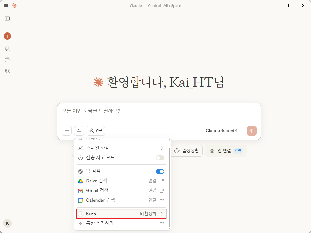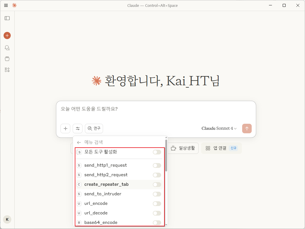 Claude Desktop 재시작 이후 화면을 확인해보면 프롬프트 설정에서 다음 burp 옵션이 활성화되어 추가된 것을 확인할 수 있다.