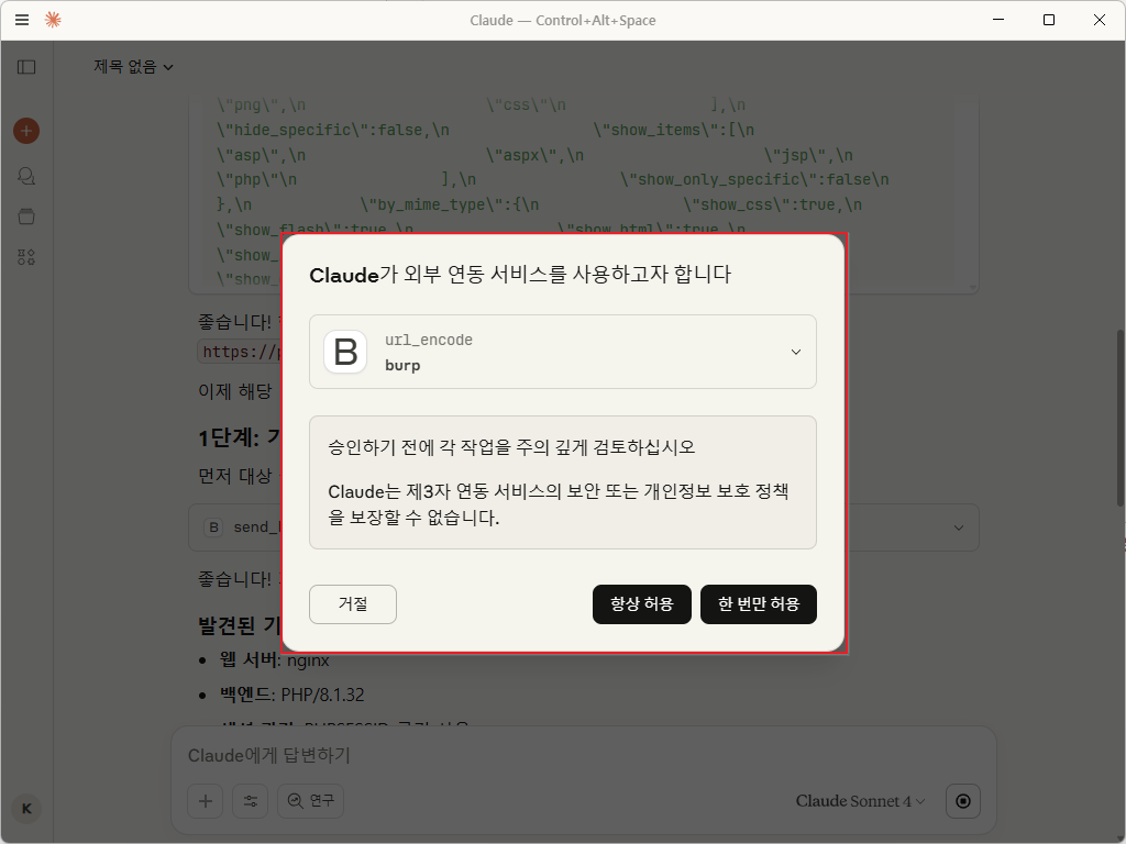 (예시 - Burpsutie #23 번 항목인 kaiht.kr 내 /server/service?test=xss 항목에 대해 분석해줘. SSRF 취약점이 의심되고 있어.) - 모든 LLM이 마찬가지이지만 해당 기능 자체가 Claude 서버와 연동되고 있으므로 보안상 노출되지 않는 범위까지 데이터가 입력되거나 노출될 수 있다. 따라서 기능 이용 후 해당 프롬프트를 삭제하거나 허가 받아 사용 되어야한다.