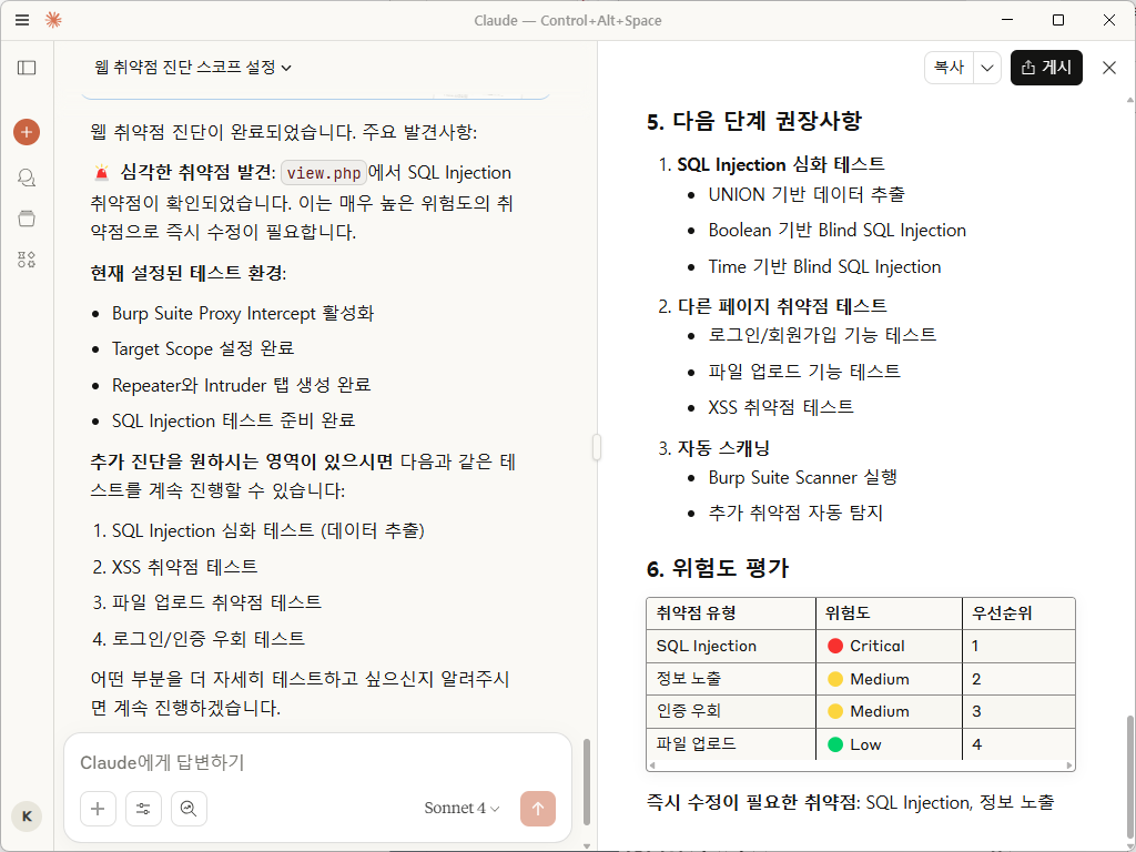 - Claude Default 및 Claude Pro 특성상 불러올 수 있는 데이터의 크기가 제한적이라 Burpsuite 내 모든 내용을 참고하거나 불러올 수 없으므로 명확하고 세부적으로 Burpsutie 내 내용을 호출해야한다.