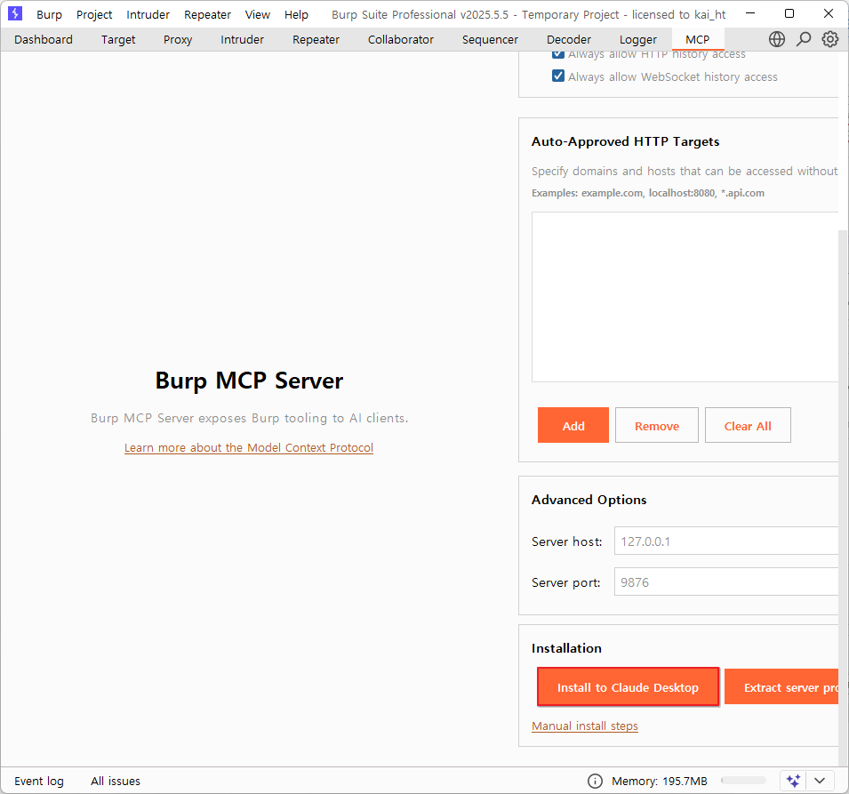- Burpsuite 에서 지원하는 확장 기능이 요구된다. 해당 MCP 서버를 이용하여 Claude 와 Burpsuite 를 연결한다. (127.0.0.1:9876)