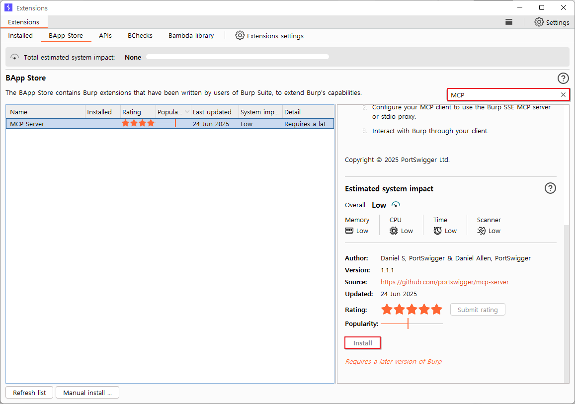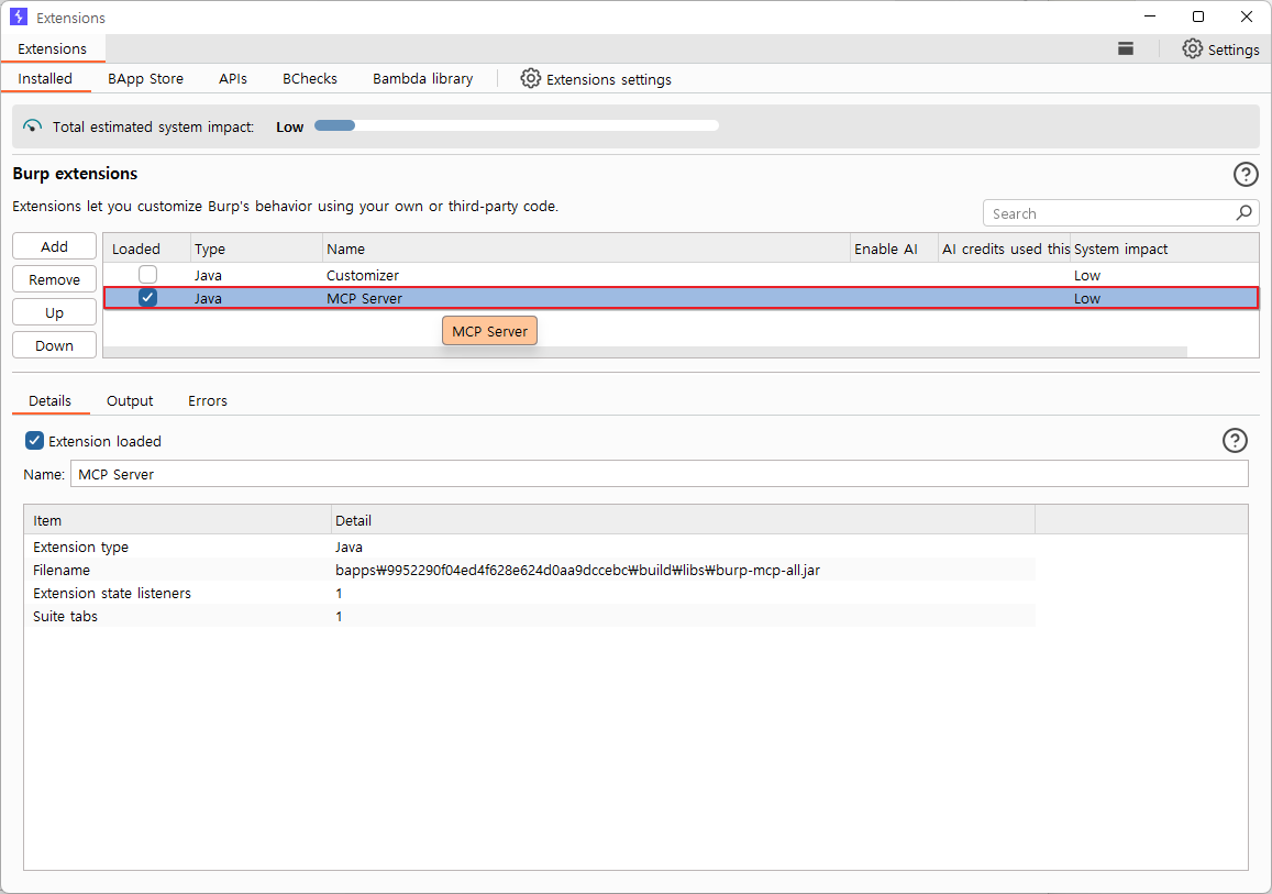프로그램 설치 이후, Burpsuite 에 접근해서 Extentions 탭에서 MCP Server 을 검색해서 추가시켜준다.
