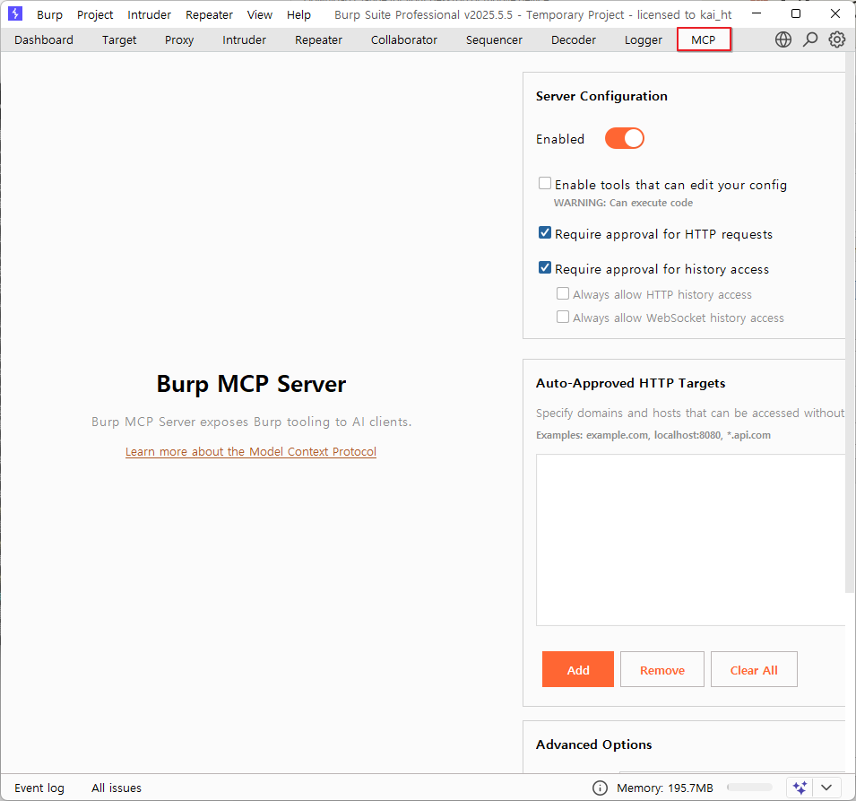 프로그램 설치 이후, Burpsuite 에 접근해서 Extentions 탭에서 MCP Server 을 검색해서 추가시켜준다.