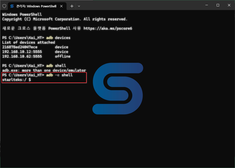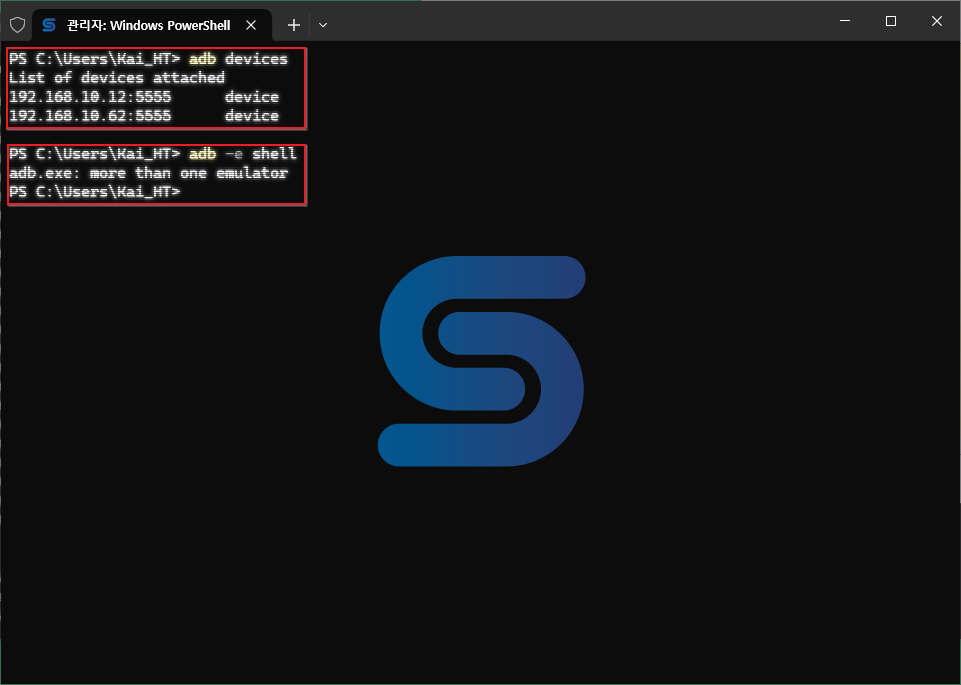 무선 ADB 로 여러 대가 연결되어 있는 경우, -e 옵션을 이용하더라도 무선 연결 디바이스가 2대 이상이기 때문에 연결이 되지 않는다. 이때 -s 옵션을 이용하여 연결해주면 되는데, 해당 옵션은 직접 본 디바이스를 선택해서 adb로 붙여주는 역할을 한다.