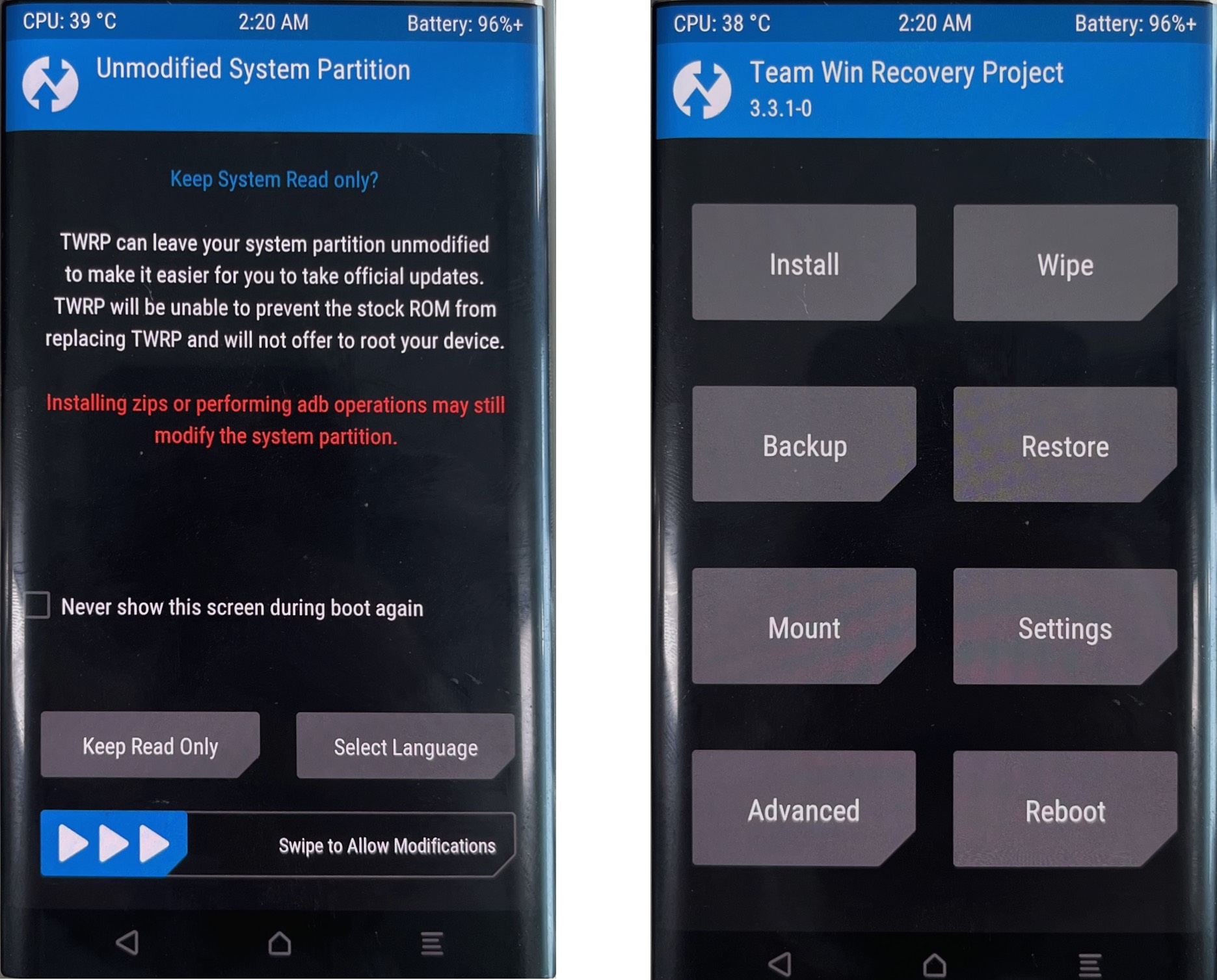 먼저 커스텀 펌웨어 설치 이전에 TWRP Recovery (Team Win Recovery Project) 라는 이름의 리커버리를 설치해야한다. 리커버리는 안드로이드에서 크게 순정 리커버리 와 커스텀 리커버리 가 존재하는데, 순정 리커버리는 디바이스 제조사에서 제공하는 리커버리를, 커스텀 리커버리는 오픈소스 진영 자유 소프트웨어에서 개발된 리커버리다.
