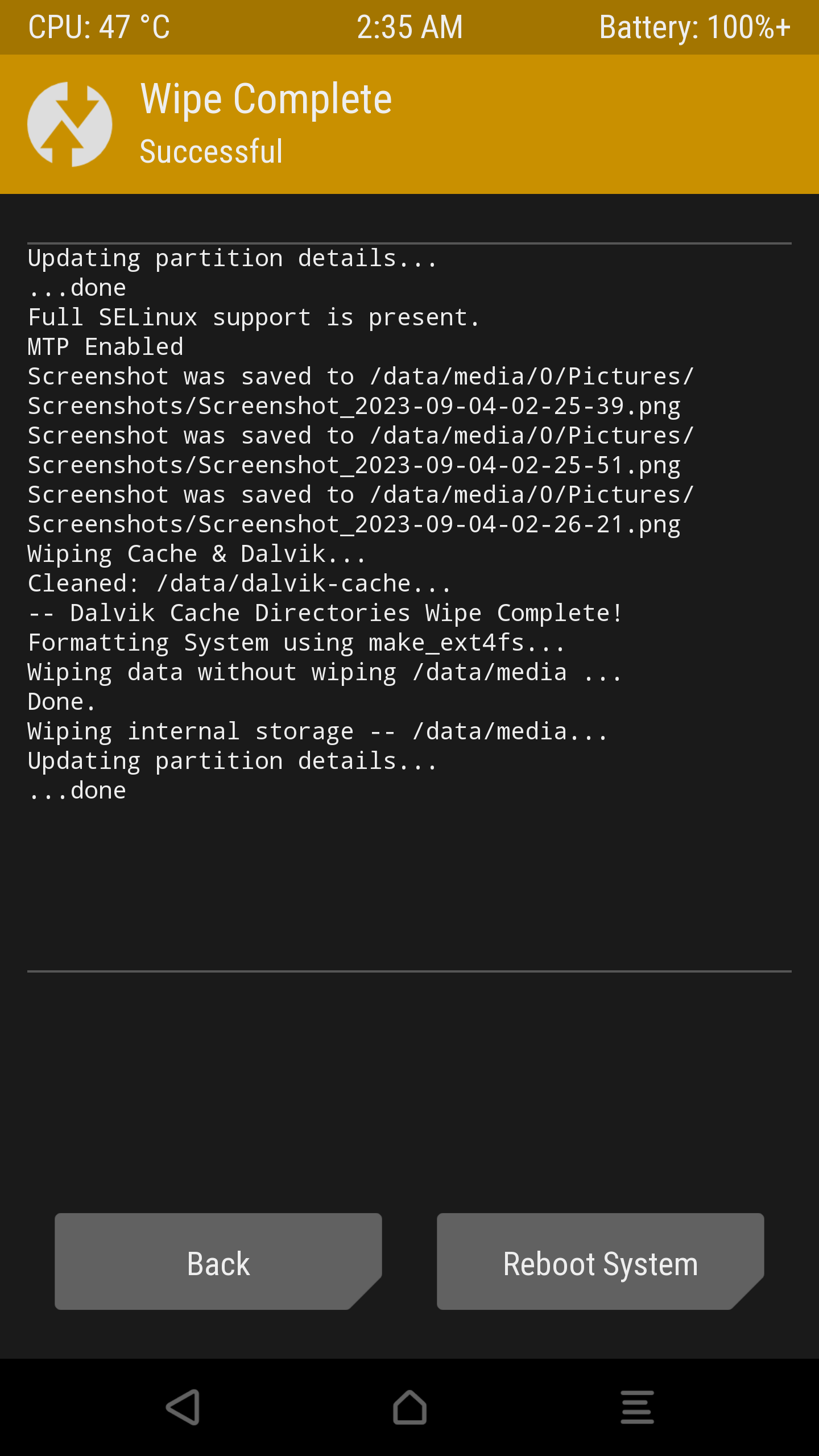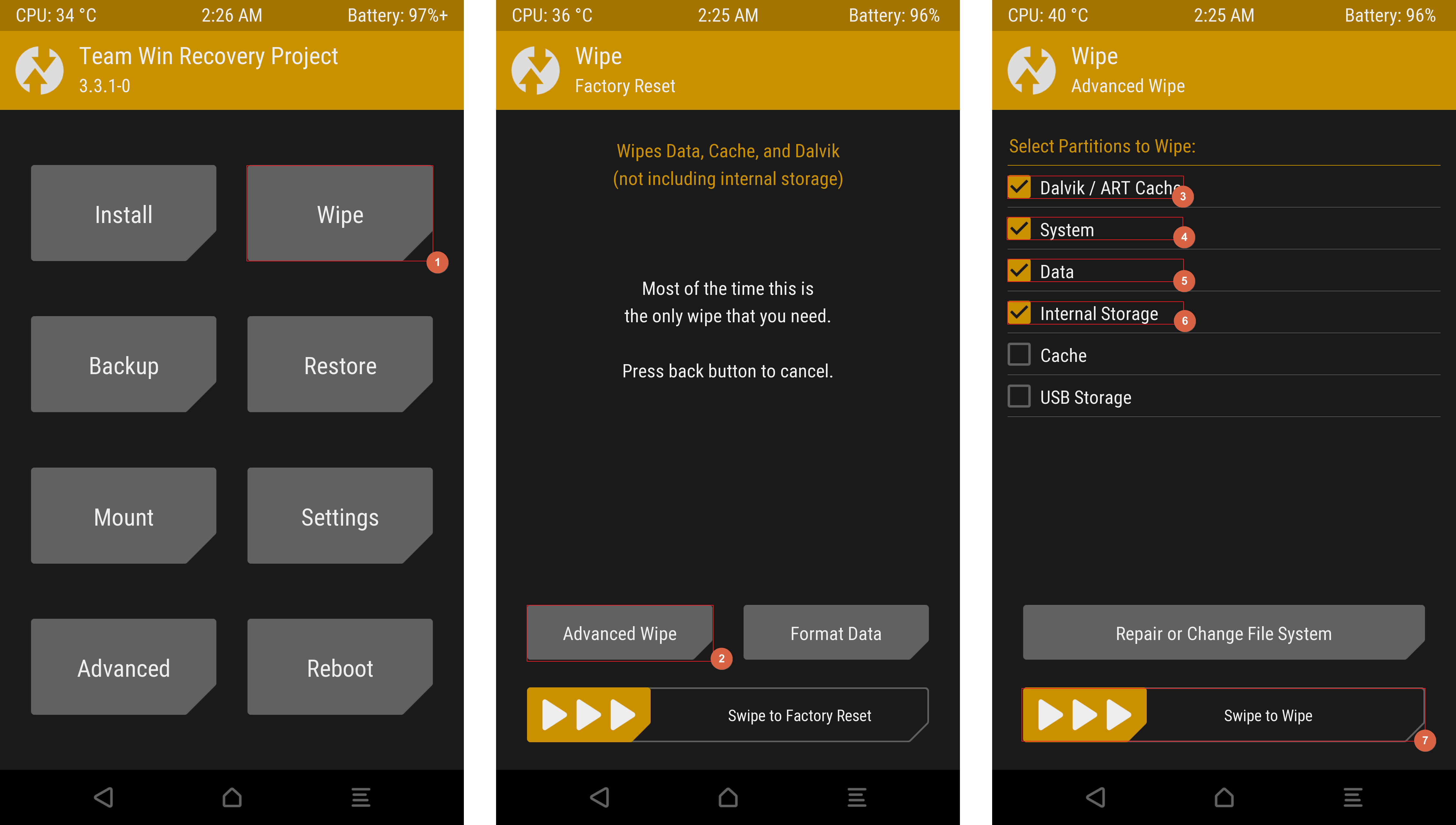 정상 설치가 완료된 이후 메뉴 중 Wipe 에 접근하여 'Advanced Wipe' 메뉴를 선택, Wipe (삭제) 할 파티션 목록으로 "Dalvik / ART Cache", "System", "Data", "Internal Storage" 파일을 선택하고 Swipe to Wipe 를 진행한다.
