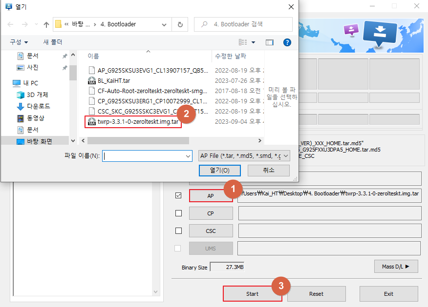 해당 모드 진입 이후 PC에 연결하고 해당 PC에서 Odin 을 실행하여 우측 하단 업로드 목록 중 AP 로 "TWRP Recovery" 을 선택한다.