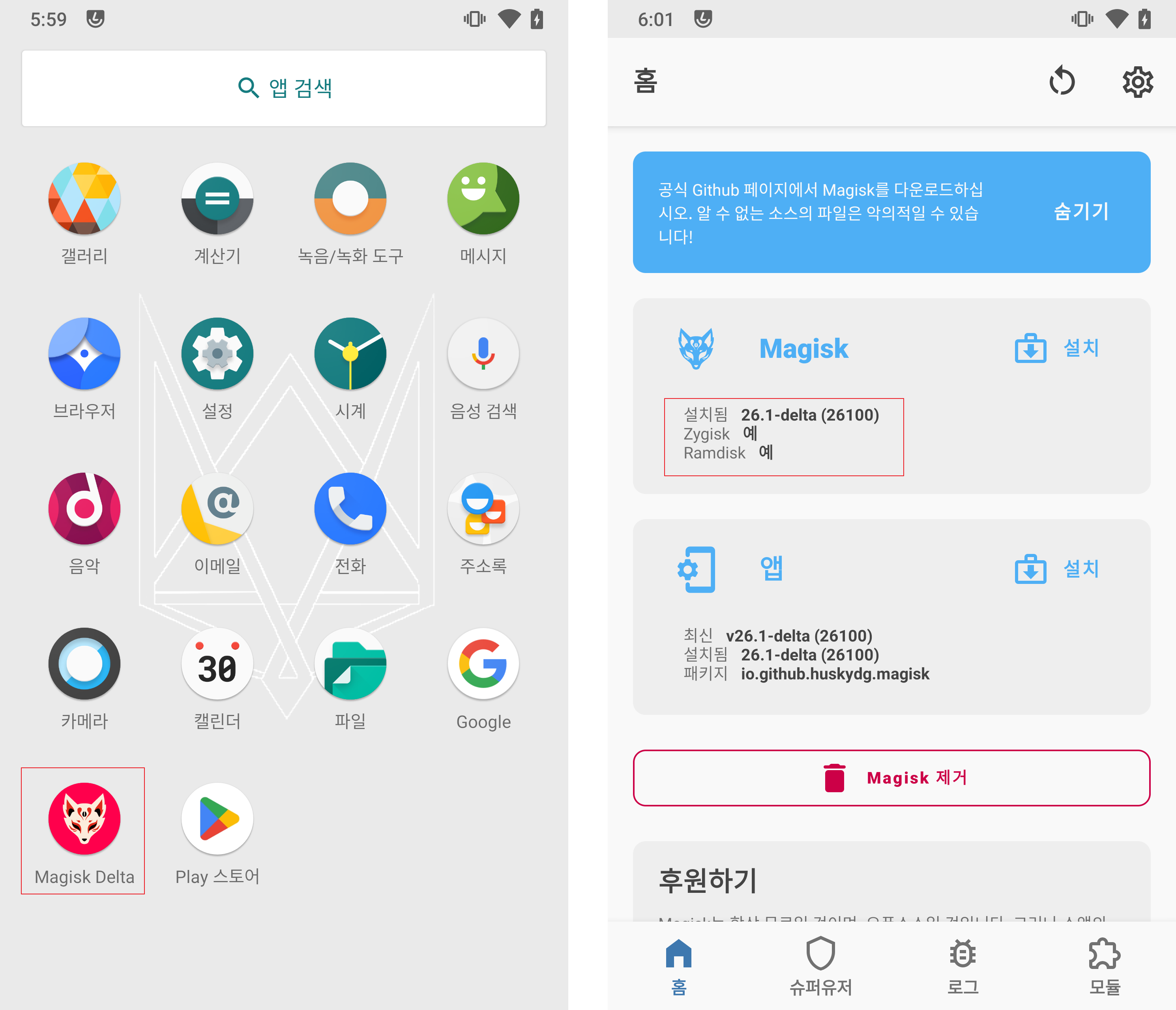 OS 내 화면 확인 시 Magisk Delta 도 정상 설치 된 것을 확인할 수 있다.