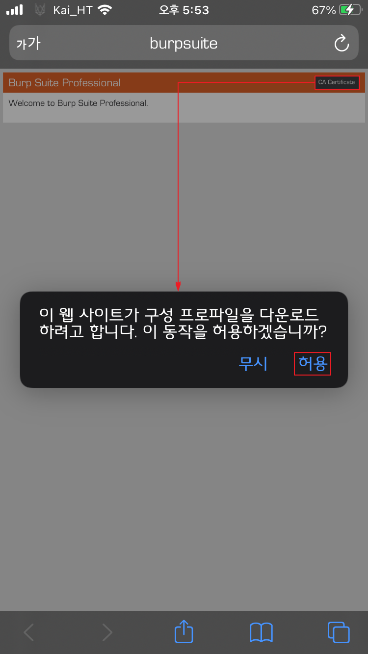 9-1.1 해당 모바일 디바이스에서 "http://burpsuite" 에 접근하여 'CA Certificate' 로 인증서를 추가해준다..