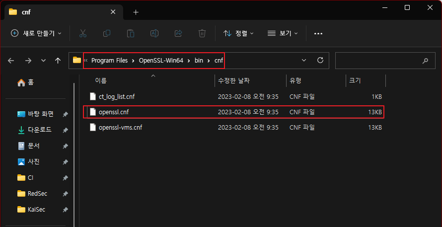 1. OpenSSL 프로그램을 설치하고 프로그램이 설치된 위치의 'openssl.cnf' 파일의 위치를 확인한다.