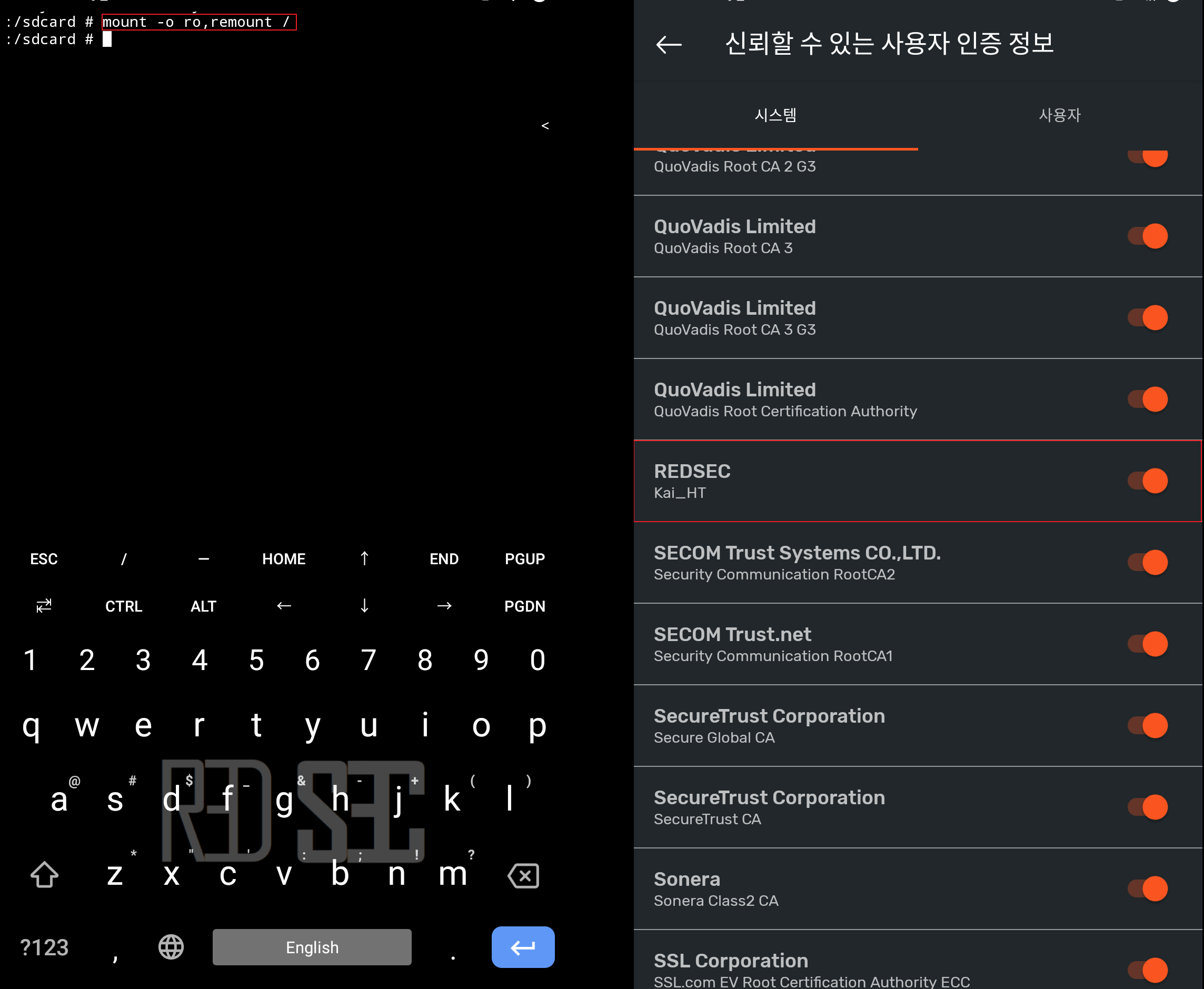 다운로드 후 콘솔 (혹은 adb shell) 에서 명령어 입력 후 인증서 파일 복사