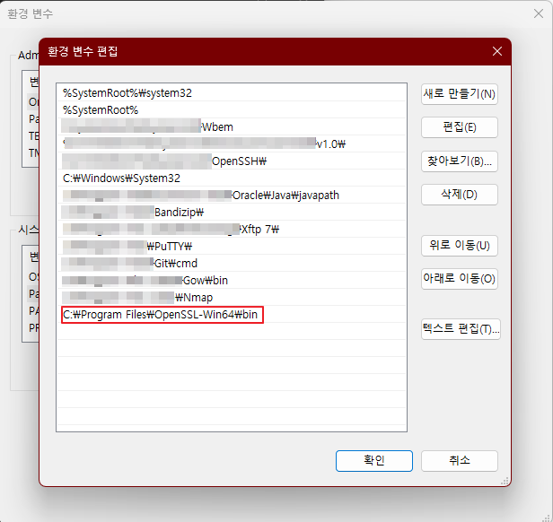 ※ 설치하고 나서 openssl 의 실행파일 위치를 환경 변수에 추가해주자.