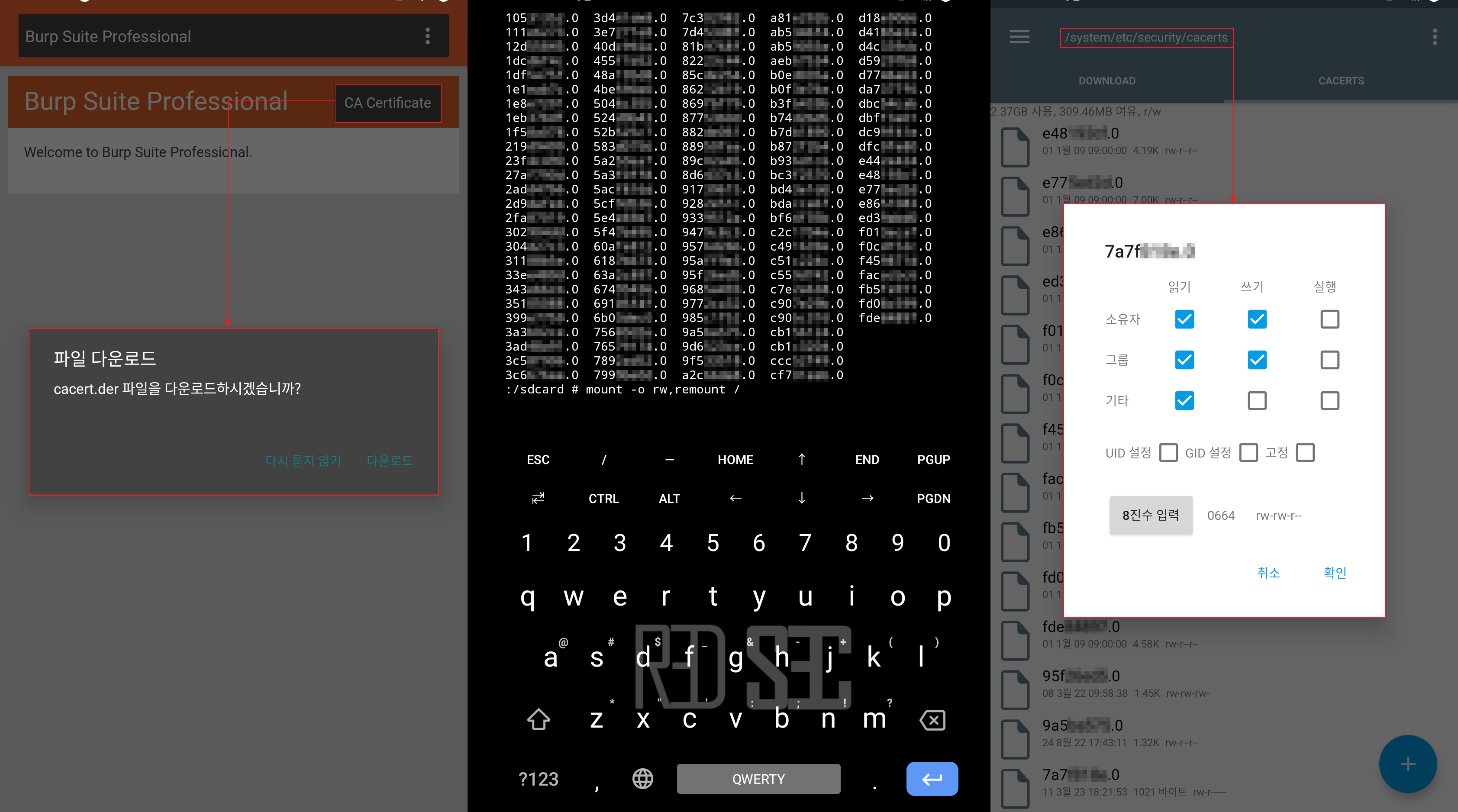 경로 '/system/etc/security/cacerts' 에 해당파일 복사, 644 권한을 부여한다.