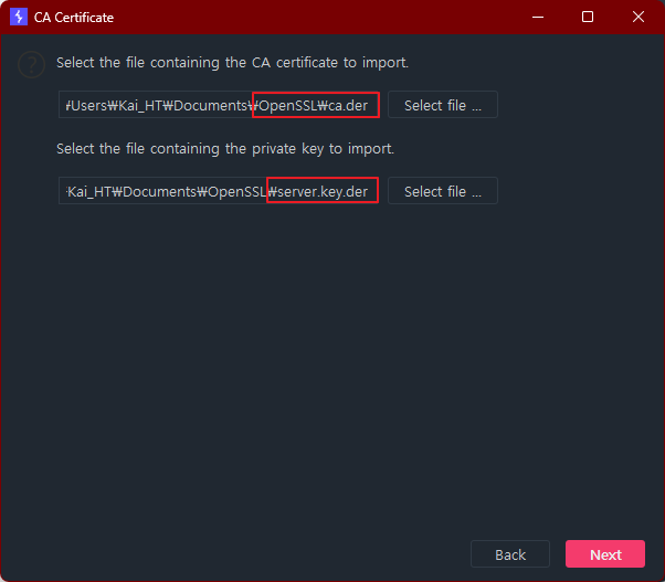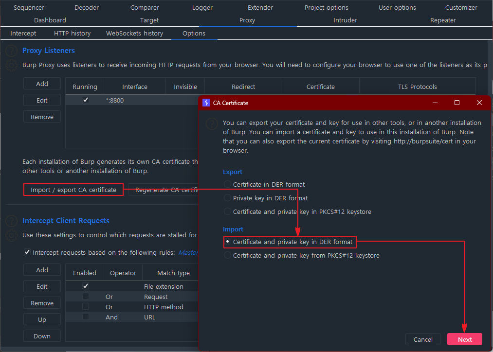 8. 파일 세 개 - 해시값.0, ca.der, server.key.der 를 확인하고 .der 파일들을 버프슈트에 넣어준다.