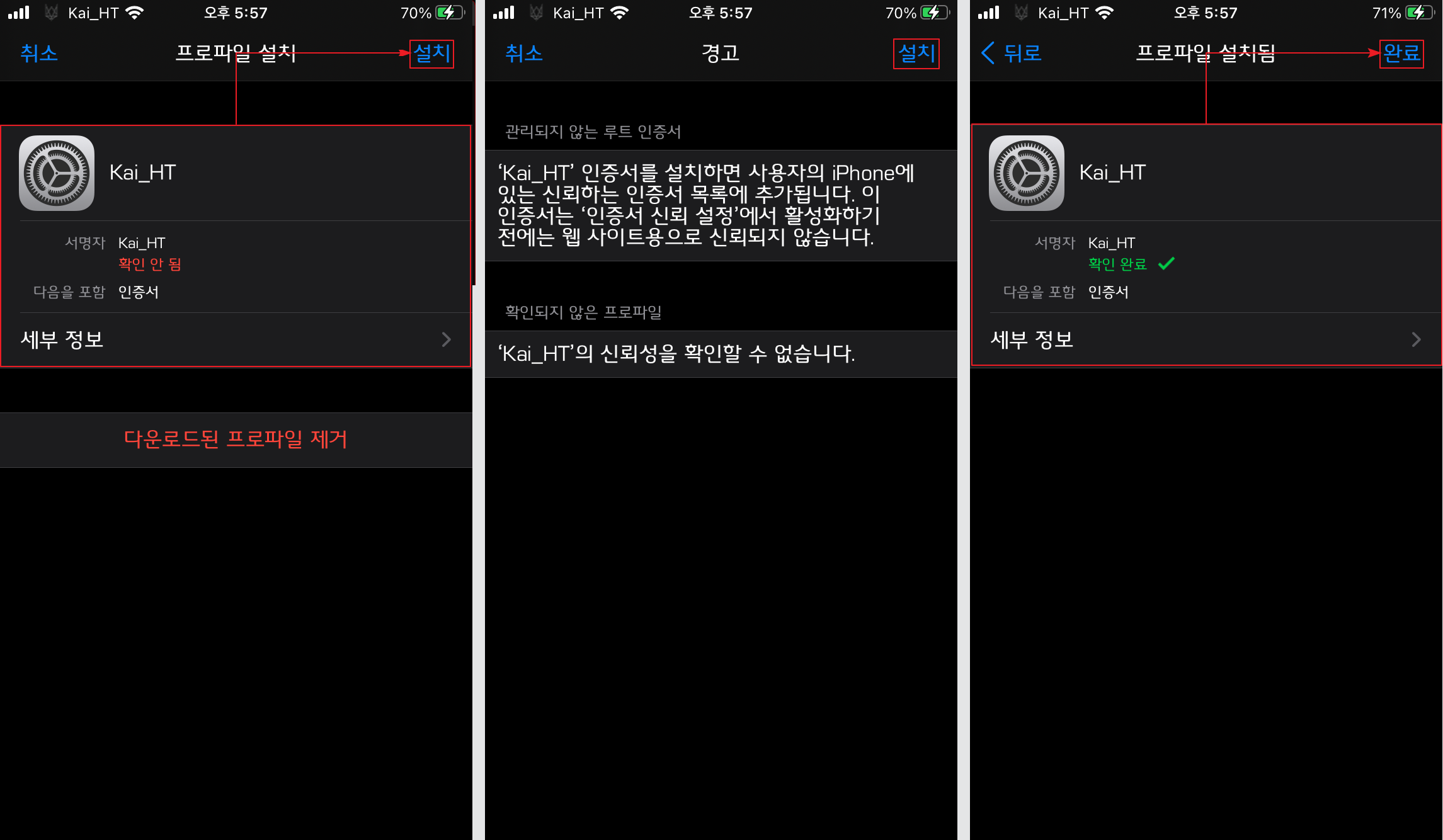 9-1.2 아이폰 기준, '일반-프로파일 및 기기 관리-다운로드된 프로파일' 메뉴에 접근하여 인증서 설치를 진행함.