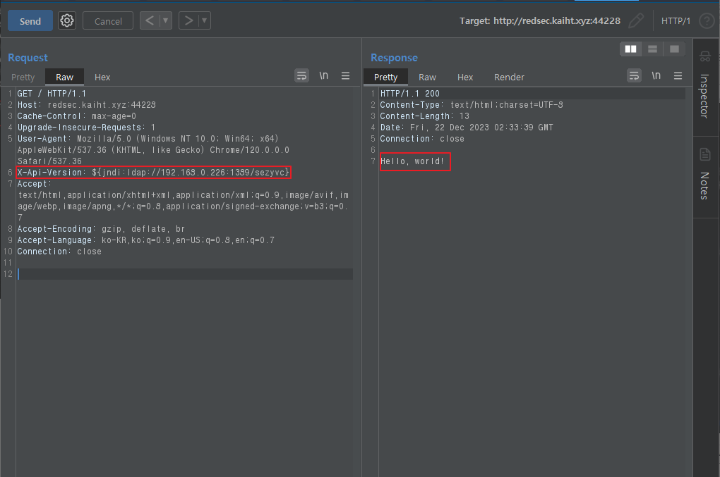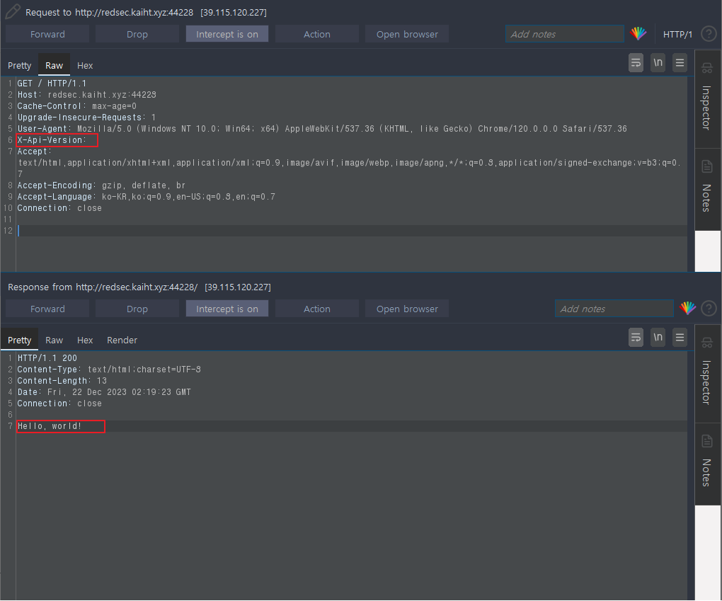 3. 페이지 접근 시 요청 패킷 헤더 내 'X-Api-Version' 을 입력하여 공격대상 서버에 전달 시, 서버에서 'Hello, world!' 라는 문자열을 서버 반응 값으로 응답하는 것에 대한 확인이 가능하다.