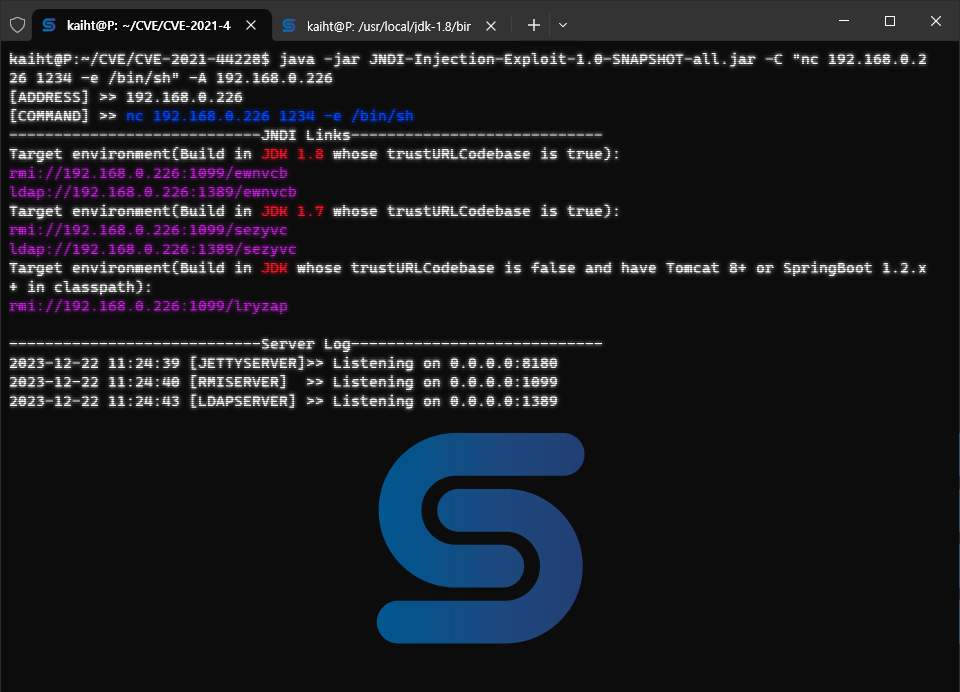4. 서버에 대한 응답확인이 끝났다면 JNDI-Injection-Exploit 코드를 실행시켜 악성 LDAP 서버를 활성화 시킨다.