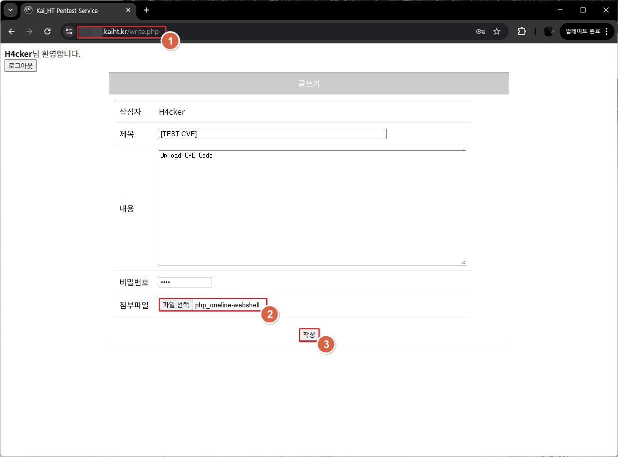 우선 공격 대상 웹 서비스 내 명령어를 실행시켜야하므로 업로드 취약점이 발생하는 구간 내 웹쉘 업로드를 수행해준다.