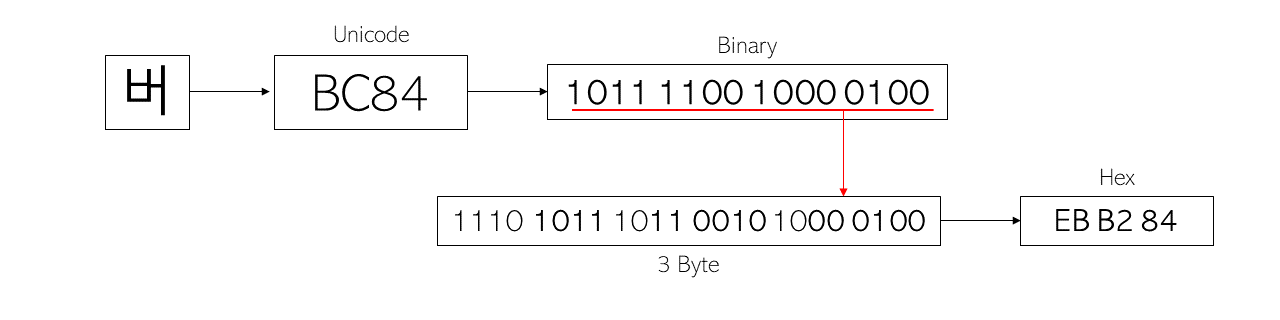 버 라는 한글 문자는 유니코드 값으로 0xBC84 인데, 이진 수로 변환 시 1011 1100 1000 0100 이다. 해당 값은 16 Bit 으로 가용공간이 16 Bit 인 3 Byte 용량의 공간이 필요하며, 각각의 비트를 가용공간 순서대로 채워 넣을 시 1110 1011 1011 0010 1000 0100 이 되며 해당 값은 다시 16진수로 변환, 0xEB 0xB2 0x84 가 된다. 이 값을 이용하여 HTTP 통신으로 전송하게 되면 URL 인코딩 값은 %EB%B2%84 가 된다. URL 내 포함된 한글 문자가 해당 형식으로 보이는 것은 UTF-8 로 변환되었기 때문이다.