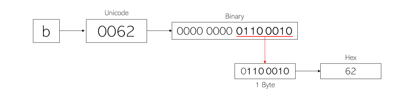 b라는 알파벳 소문자 유니코드 값은 0x0062 로 해당 값을 이진 수로 나타내면 0000 0000 0110 0010 이다. 해당 값에서 마지막 데이터 110 0010 는 7Bit 에 저장할 수 있으므로 가용공간 1Byte 용량에 담는 것이 가장 효율적이며 다음과 같이 변환할 수 있다. → 0110 0010 값으로 전환되고 0x62 로 변환된다.