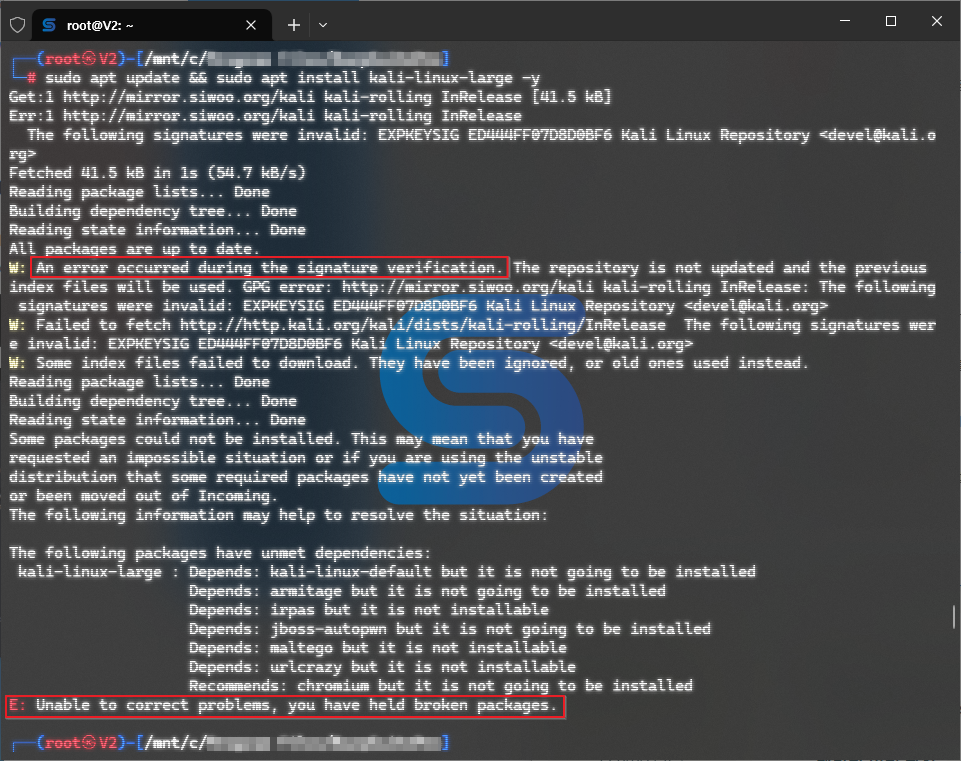 I'm running Kali Linux in WSL2. It's a new installation (using wsl --install) but when I try to apt-get update I get the following error: W: An error occurred during the signature verification. The
