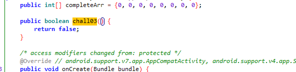 challenge_03 에 해당하는 chall03 은 MainActivity 내부에 선언되어있고, 본래 false 로 선언한다. 해당 값을 변경시켜주기 위해선 overload 라는 것을 진행해야 하는대, 해석 그대로 중복정의를 true 라는 값으로 해주는 것이라 생각했다.