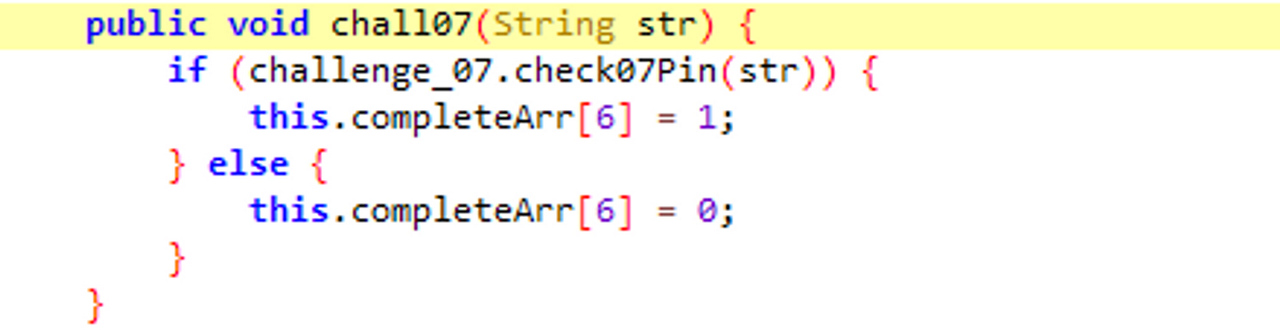 setChall07() 을 통해 랜덤으로 1,000 부터 9,999 까지 수를 chall07 에 저장한다. 그렇기에 check07Pin() 으로 chall07 과 인자를 비교해볼 수 있다.