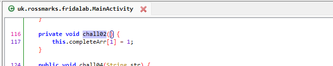 문제 그대로 chall02() 함수를 실행시키면 풀리는 챌린지다. 그럼 FridaLab 에서 chall02() 가 뜻하고 있는 것이 무엇인가 확인해보자.