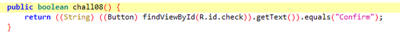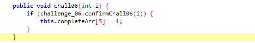 우선 chall06() 을 MainActivity 에서 int형 인자를 challenge_06.confirmChall 에 전달하여 confirmChall06(i) 의 결과가 True 일 경우, 해결된다.