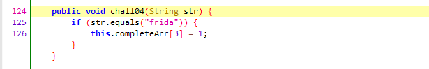 2번 문제와 마찬가지로 main.chall04() 를 호출 한 뒤, 인자로 "frida" 를 입력하면 된다 생각하였고, 이전 코드에서 main.chall04("frida") 를 입력해 해당 챌린지를 풀어내었다. chall04 를 확인하면 이전 3번과 마찬가지로 MainActivity 내부에 존재하며, if문으로만 이루어져 있기 때문에 문자열을 입력하는 것으로 풀이하면 된다.