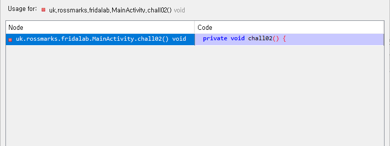 문제 그대로 chall02() 함수를 실행시키면 풀리는 챌린지다. 그럼 FridaLab 에서 chall02() 가 뜻하고 있는 것이 무엇인가 확인해보자.
