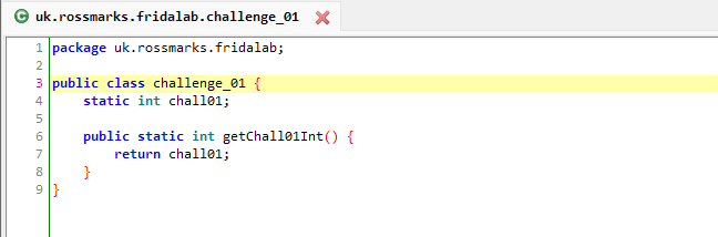var challenge_01 = Java.use('uk.rossmarks.fridalab.challenge_01');