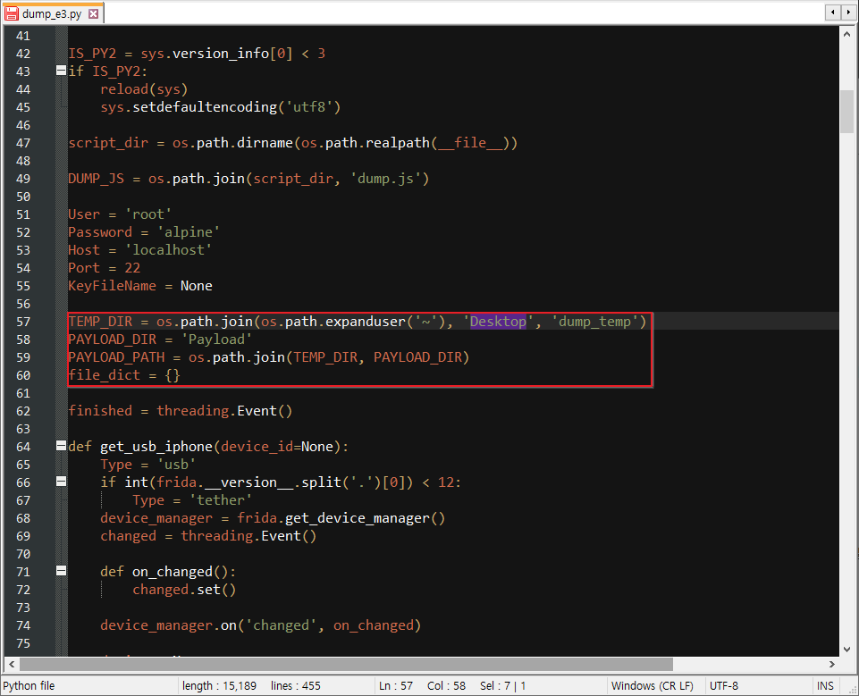 점검 PC 와 점검대상 iOS 디바이스를 연결하게 되면 frida-ls-devices 명령을 통해 확인 가능한 것 처럼 부가적인 장비를 연결하지 않았음에도 usb Type 을 가지는 공백의 데이터가 추가된다. 해당 문제 때문에 Frida 에서 오류를 일으켜 탐지를 못하는 것으로 보인다. 때문에 Frida 를 이용하는 경우 디바이스 명을 지정해주는 -D 옵션이나 PID 를 지정해주는 -p 옵션, 그리고 Objection 상에는 -S 옵션을 적용해주면 해결되는 문제이긴 하나, 본 코드인 'frida-ios-dump' 이나 이후 작성할 'fridump' 에선 지정되어있지 않은 옵션이다.