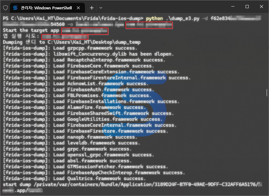 바탕화면 내 dump_temp 폴더 생성 후, 해당 폴더의 권한을 설정해준 다음 덤프 시 생성되는 덤프 파일을 저장한다.이후 해당 덤프가 완료되면 덤프가 실행된 디렉토리 내 ipa 파일을 저장시키게 된다.