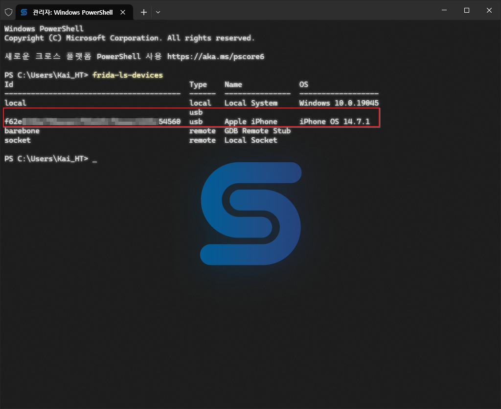 Device_ID 를 지정하는 기능은 앞서 증적에 작성한 내용대로 'frida-ls-devices' 를 통해 확인된 디바이스 명을 입력하여 해당 디바이스에서 실행되고 있는 타겟 앱에 대한 iOS 를 추출하는 기능이다.
