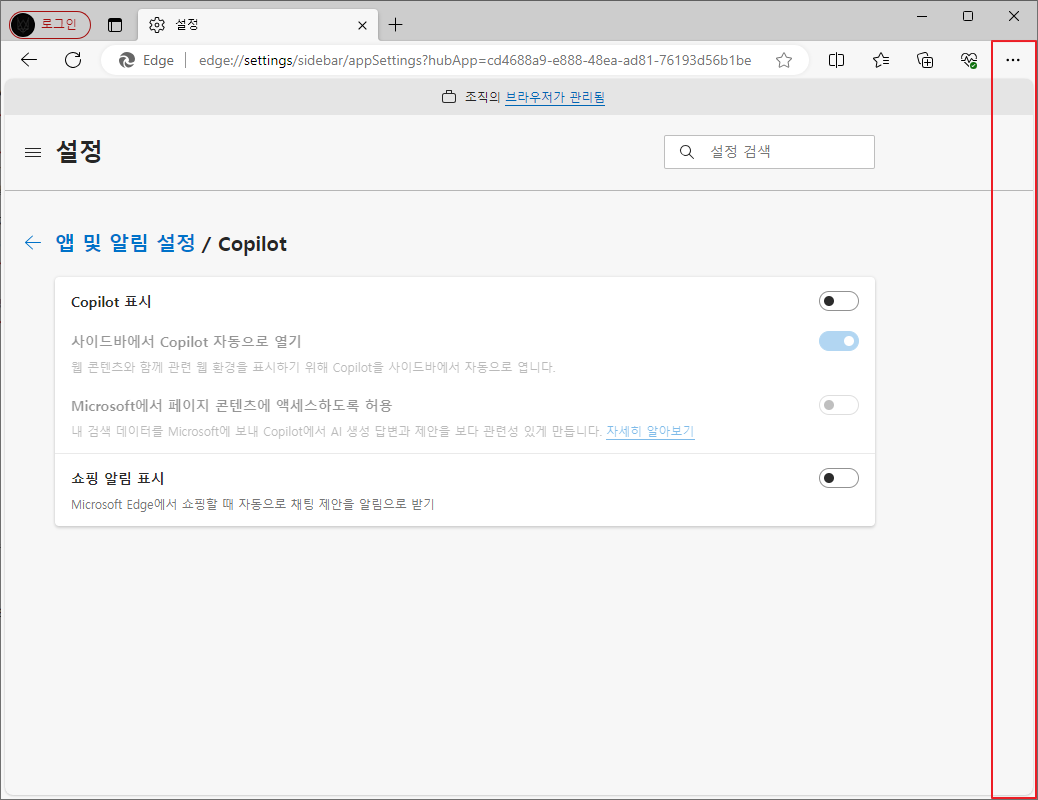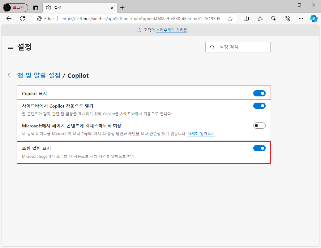 해당 옵션에 접근하게 되면 낙인처럼 박혀있는 Copilot 로고를 화면에서 없애버릴 수 있는 Copilot 표시 옵션이 보이는데, 그걸 꺼버리자. (본인은 그 밑에 있는 쇼핑 알림도 회사에서 볼 일이 없어서 그냥 껐다. 이것도 본인 취향대로 설정하자.)