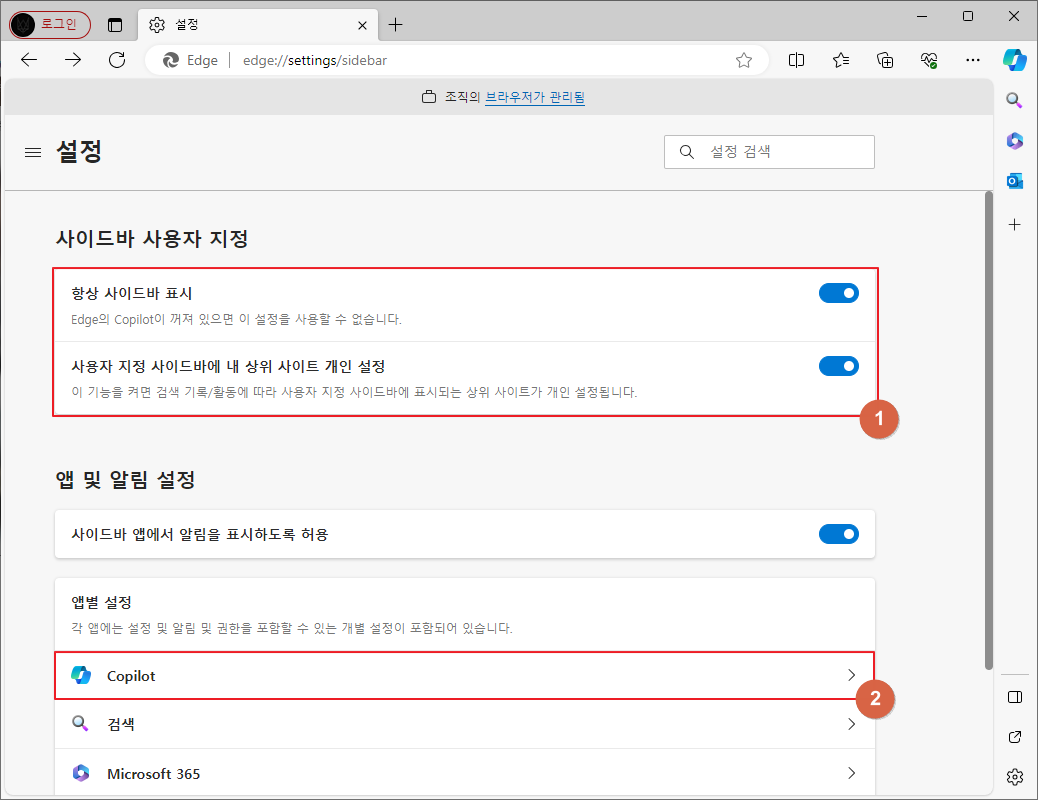 설정 기능에 접근하게 되면 사이드바 설정 옵션들이 보이는데, 여기에서 항상 사이드바 표시 기능을 끄고 (사용자 지정 기능의 경우 꺼도되고 안꺼도된다. 본인은 이것도 그냥 끄는게 편해서 껐다.) 하단에 보이는 앱 및 알람설정 - Copilot 옵션에 접근한다.