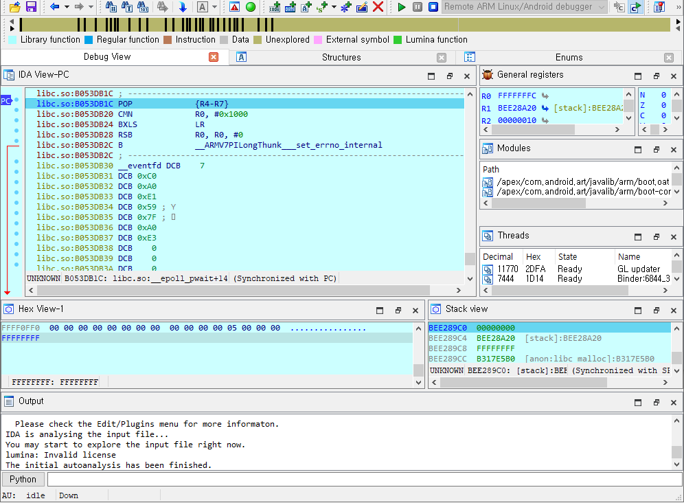 7. 정상 Attach 완료 시 앱이 일시정지 되며 IDA 화면 내 디버깅 화면 확인이 가능하다.