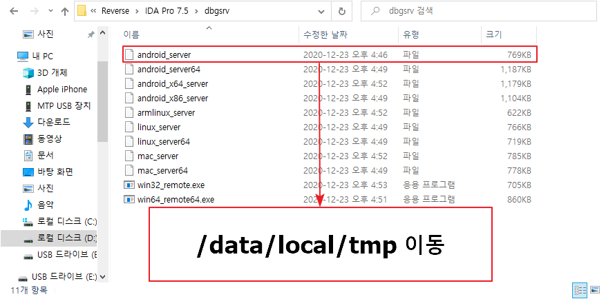 1. 진단 PC 내 IDA 설치 디렉터리를 확인하여 디렉터리 내 존재하는 디버깅 파일 'android_server' 파일 확인 후 해당 파일을 진단 기기 내 임의 폴더 (/data/local/tmp) 에 복사한다.