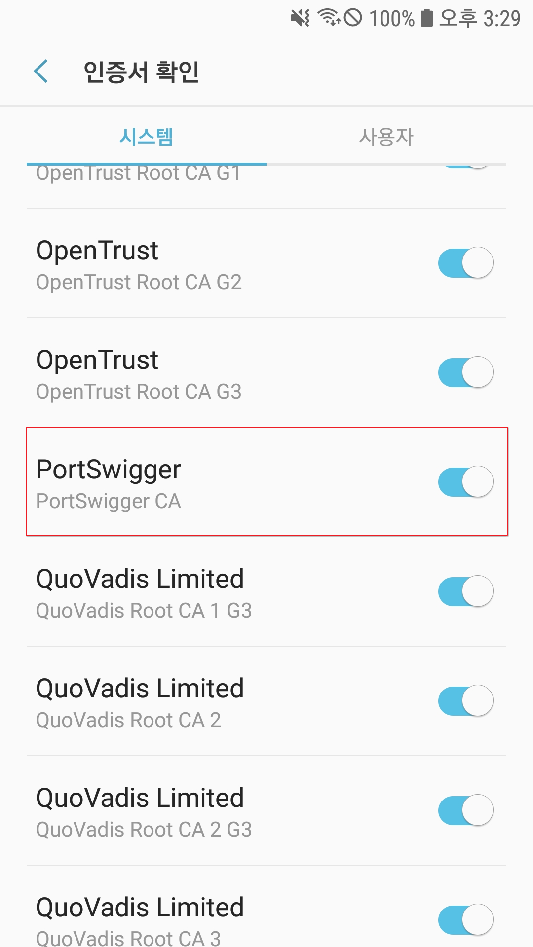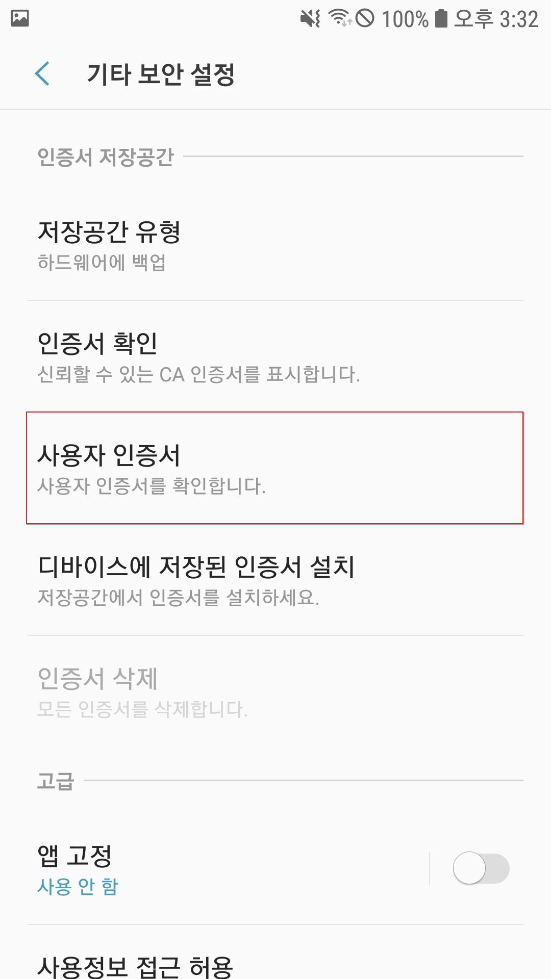 수행 이후 디바이스 재부팅 후, 시스템 메뉴 내에서 해당 인증서 확인이 가능하다.