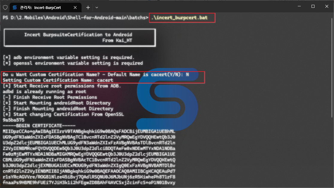 → 해당 배치파일은 adb 를 이용하여 certificate 파일을 밀어넣어준다.