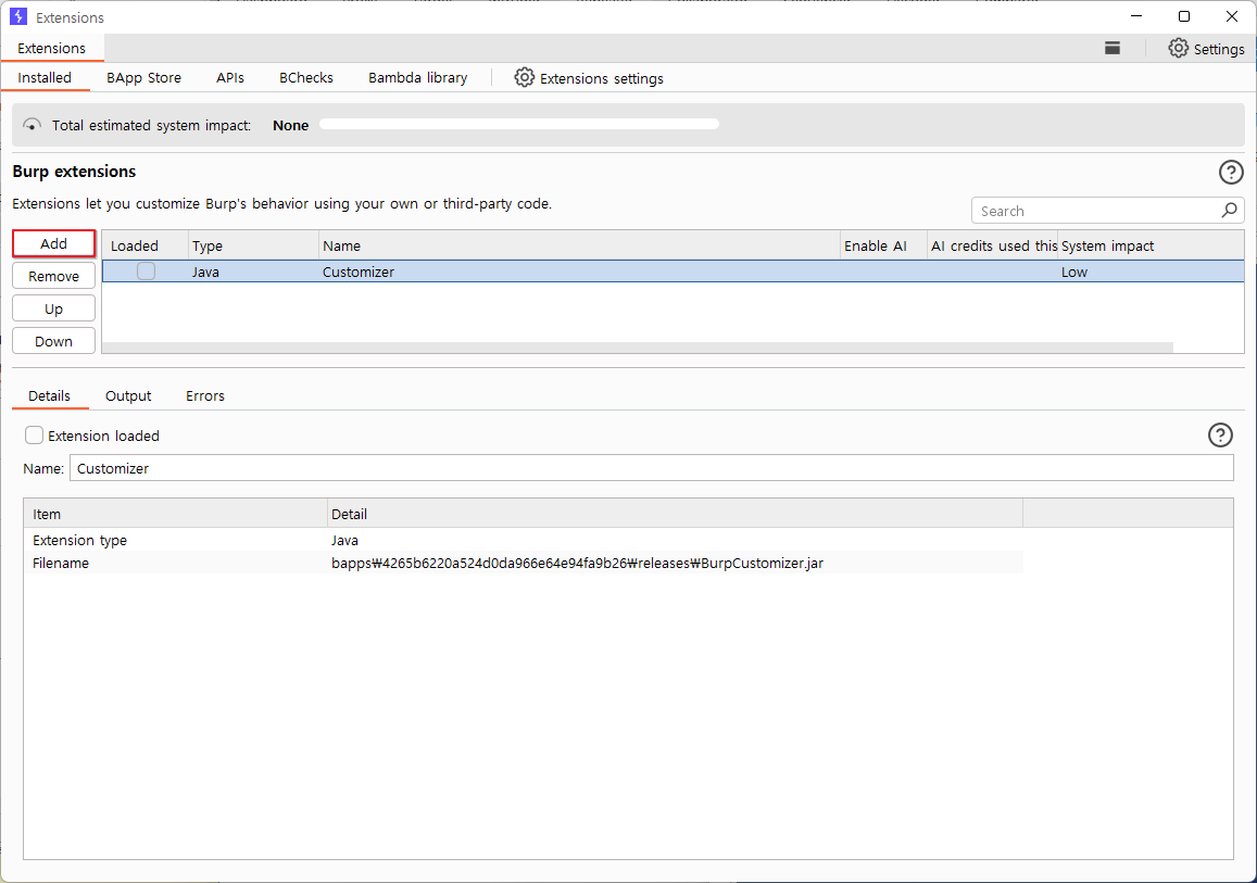 해당 파일 등록 후 Extentions 내 Add 를 통해 작성된 Extention 을 추가해준다.