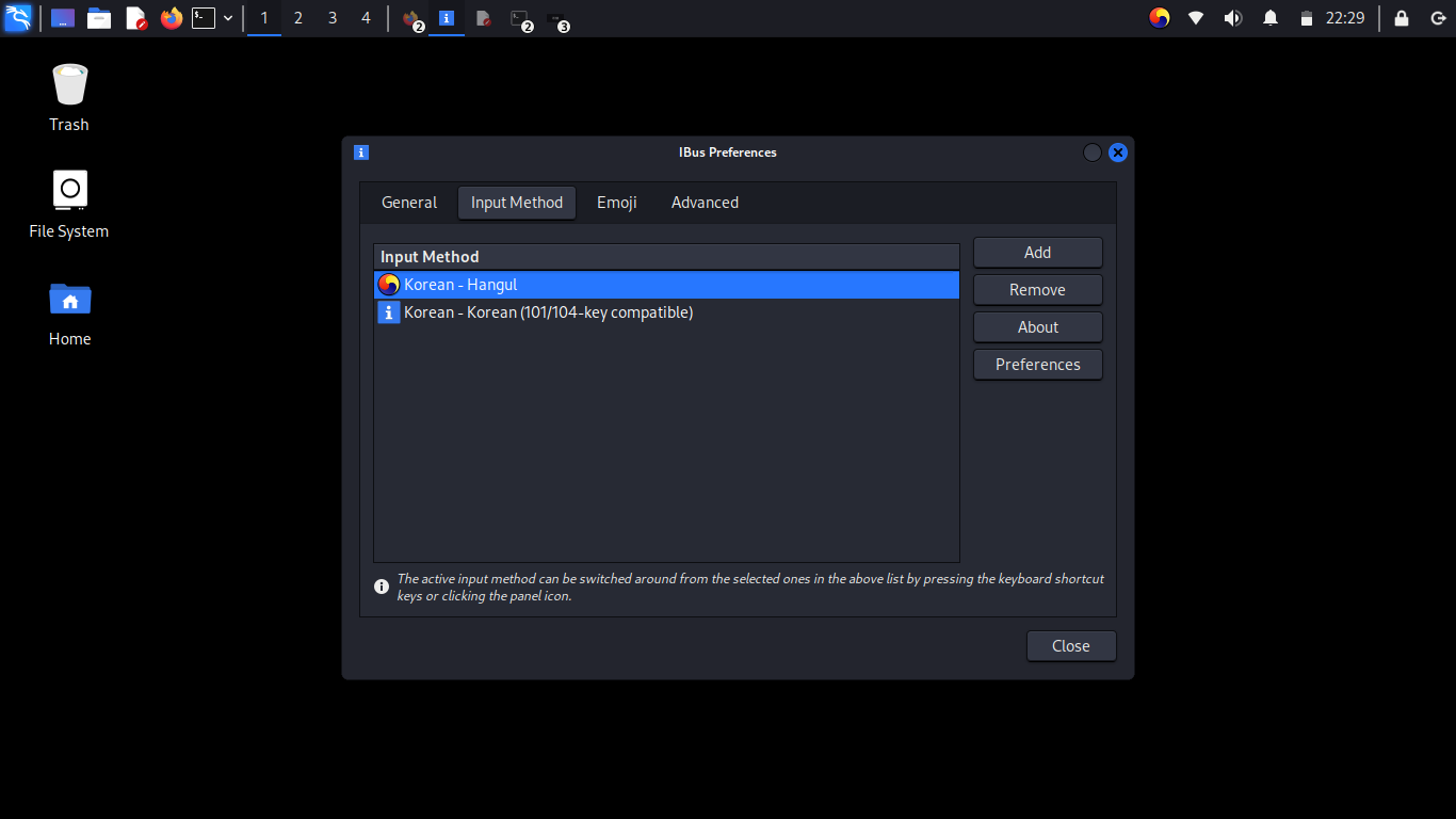 메뉴에서 iBus Preference 를 검색하여 접근, 해당 메뉴에서 Add, Select an input method 창에서 점 세개를 클릭, 검색 창에서 Korean 을 검색하면 Hangul, Korean, Korean(101/104-key compatible) 세 가지가 확인되는데, 해당 목록에서 Hangul을 선택한다. 그럼 위 화면과 같은 상태가 되는데 기본 적으로 추가되어있는 밑 항목을 Remove 하고 삭제한다.