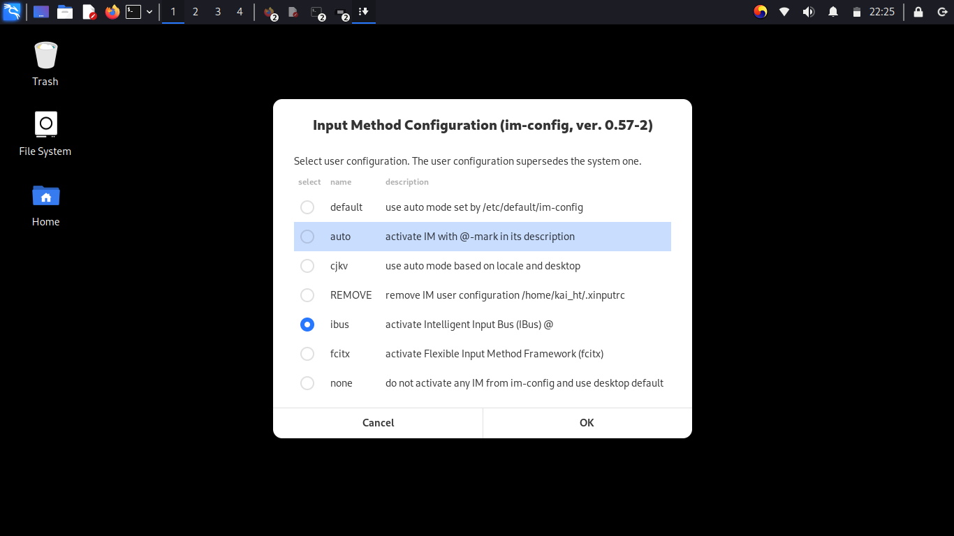 im-config 을 검색해주면 "Input Method" 메뉴가 확인된다. 해당 메뉴를 실행하면 다음과 같은 화면을 확인할 수 있으며, OK → Yes 를 입력하여 입력기 선택창을 확인한다. 해당 화면에서 ibus 입력기를 선택하고 OK 를 선택해주자.