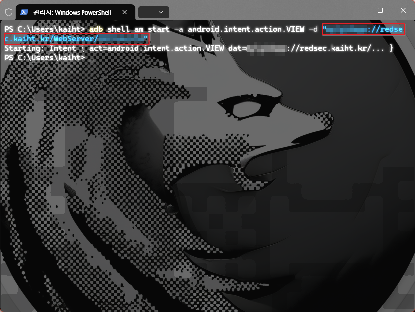 해당 명령을 이용하여 앱이 실행 여부를 이용하여 딥링크 임의 실행 여부를 파악할 수 있으며, 작성한 값 - redsec.kaiht.kr/WebServer/ 으로 앱으로 전달하는 것을 확인할 수 있다.