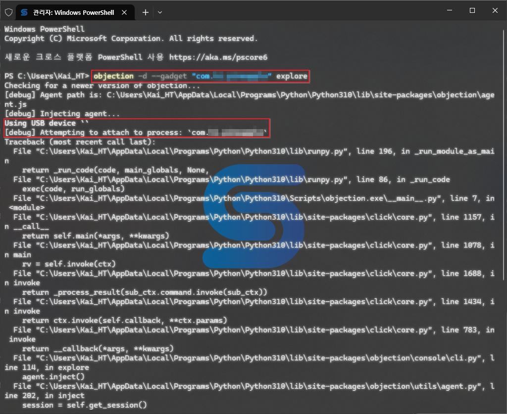 Objection 실행 시, 옵션 값으로 -S 을 넣고 그 뒤에 Frida 에서 확인한 디바이스 명을 넣어주면 정상적으로 Objection 수행이 가능하다. Frida 에서도 동일하게 수행 가능할 것으로 보고 있다.