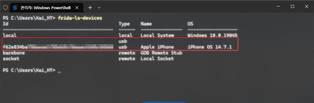 분명 usb에 해당하는 디바이스는 1건만 출력되어야하나 Id, Name, OS 값이 존재하지 않은 Type-usb 항목이 하나 확인된다. 해당 문제는 Frida 와 iOS 간 문제인 것으로 확인되나 확실한 해결책은 찾지 못했다...