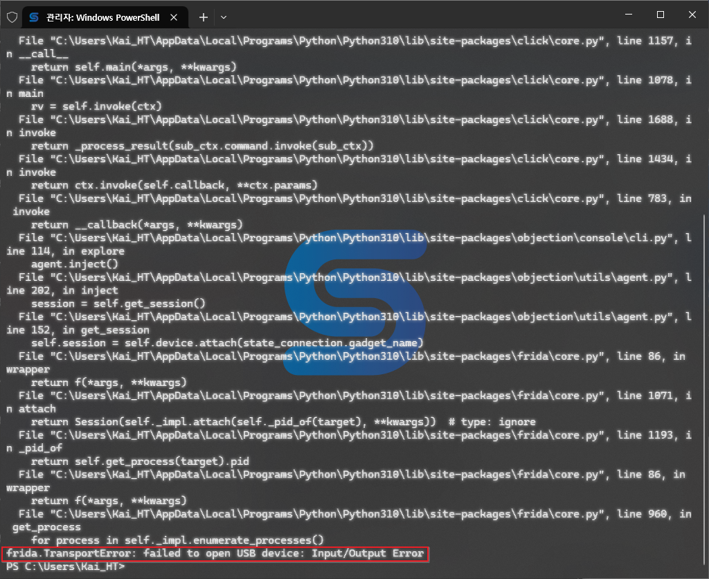 objection 실행 결과, 파이썬 에러가 노출되며, 맨 마지막 줄에서 Frida 오류코드로 'frida.TransportError: failed to open USB device: Input/Output Error' 메시지가 출력된다. Frida 와 관련하여 에러코드를 찾아보면 frida 삭제 이후 PC 내 파이썬 재설치하여 Respring 등의 방법들이 있었으나, 그럼에도 불구하고 해당 오류는 고쳐지지 않았다.