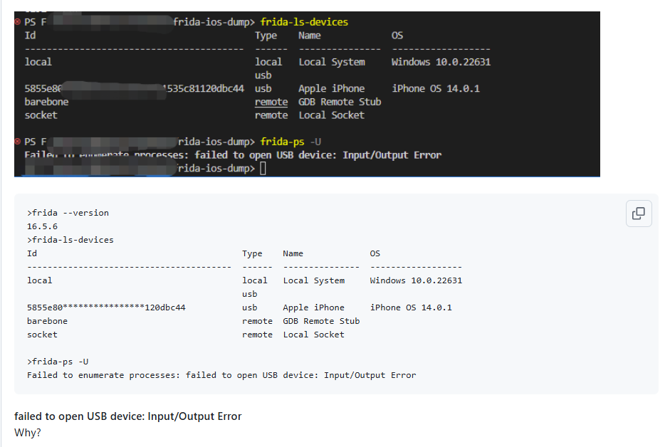 frida-ps -U failed to open USB device: Input/Output Error · Issue #3278 · frida/frida