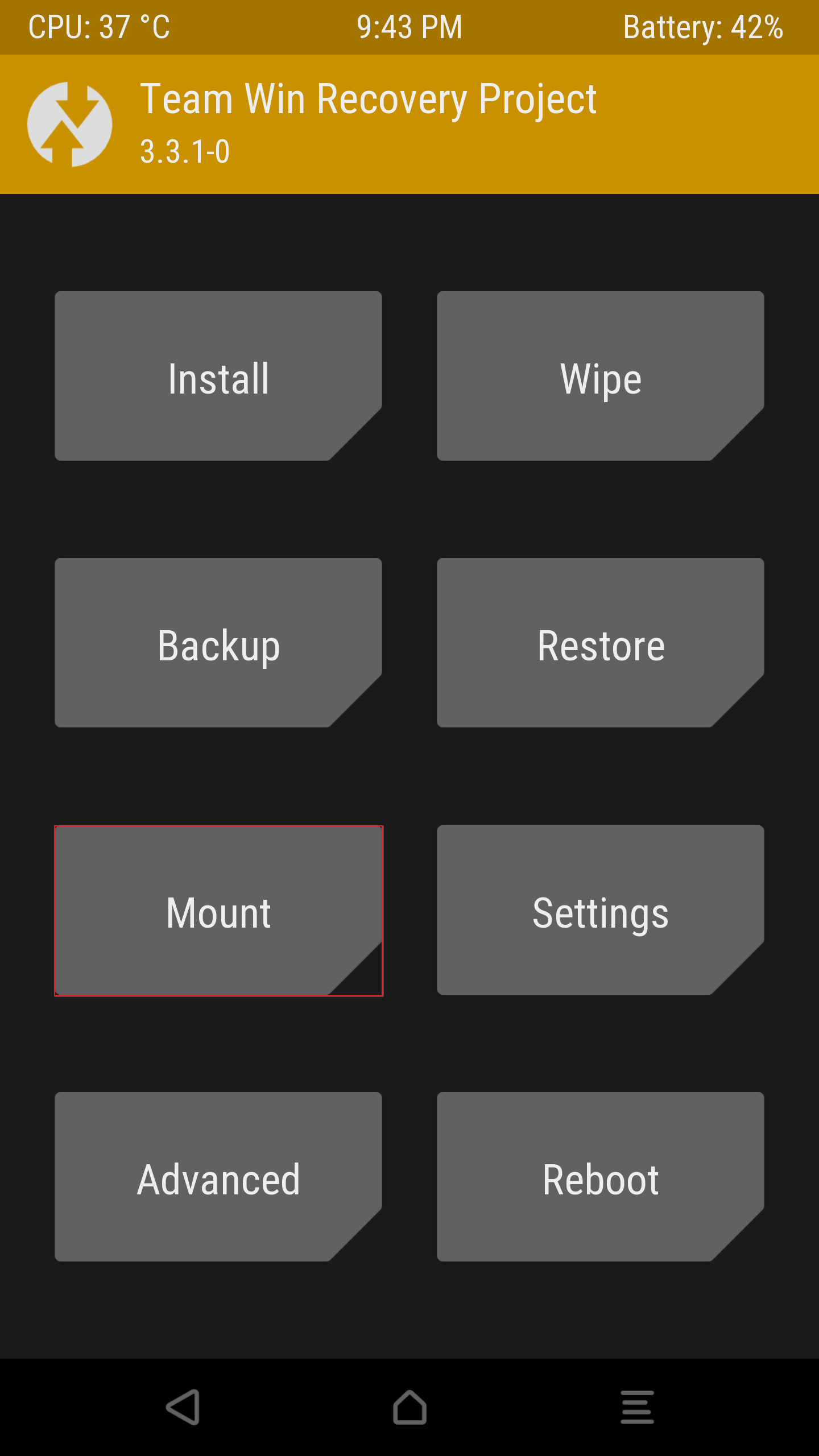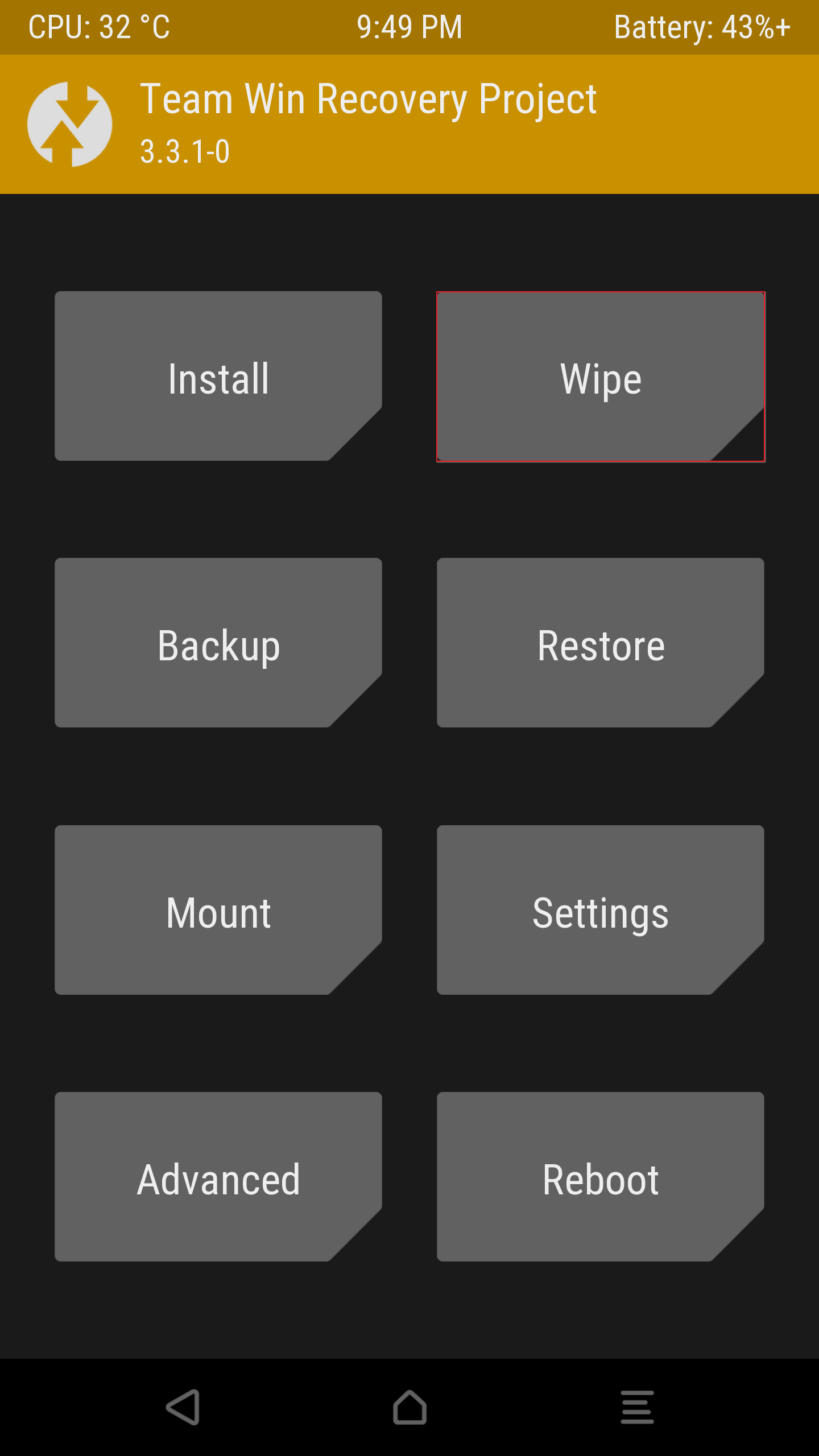 우선 해당 디바이스 종료 이후 TWRP - 커스텀 롬에 접근한다.